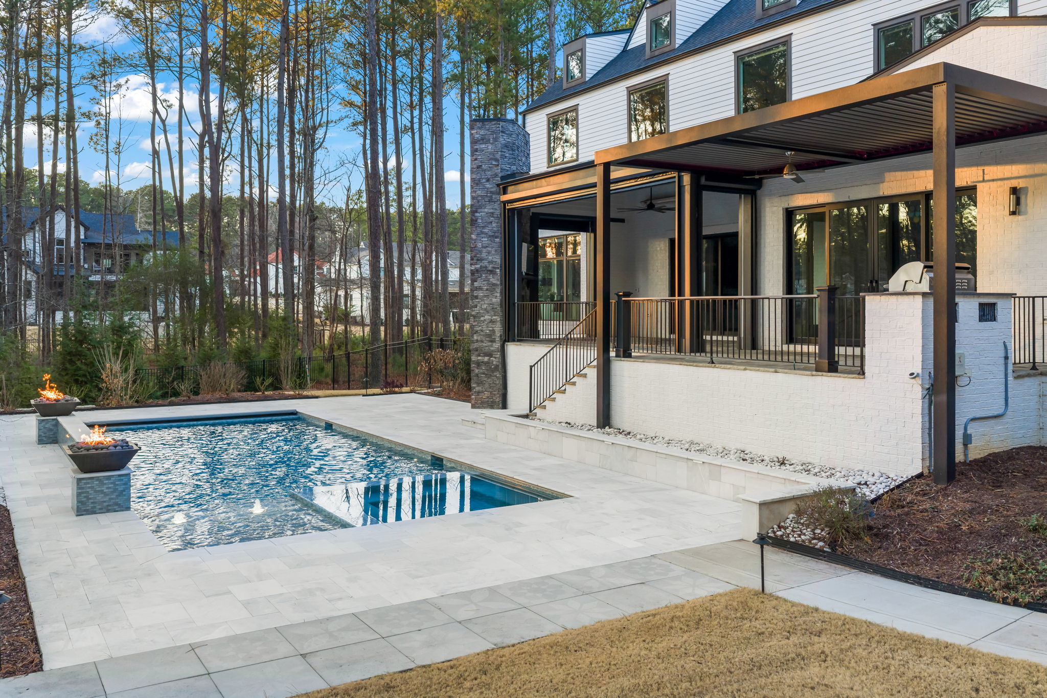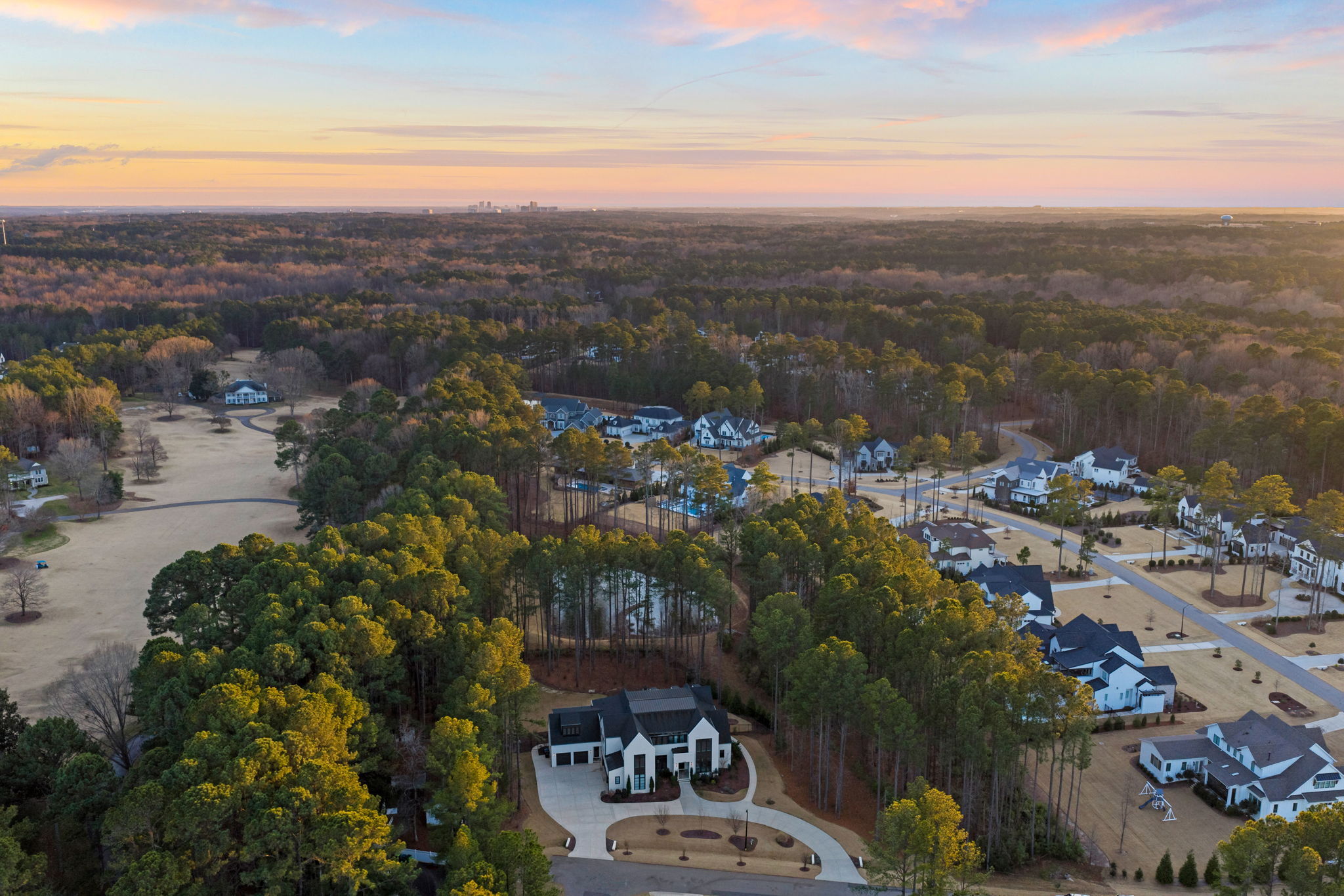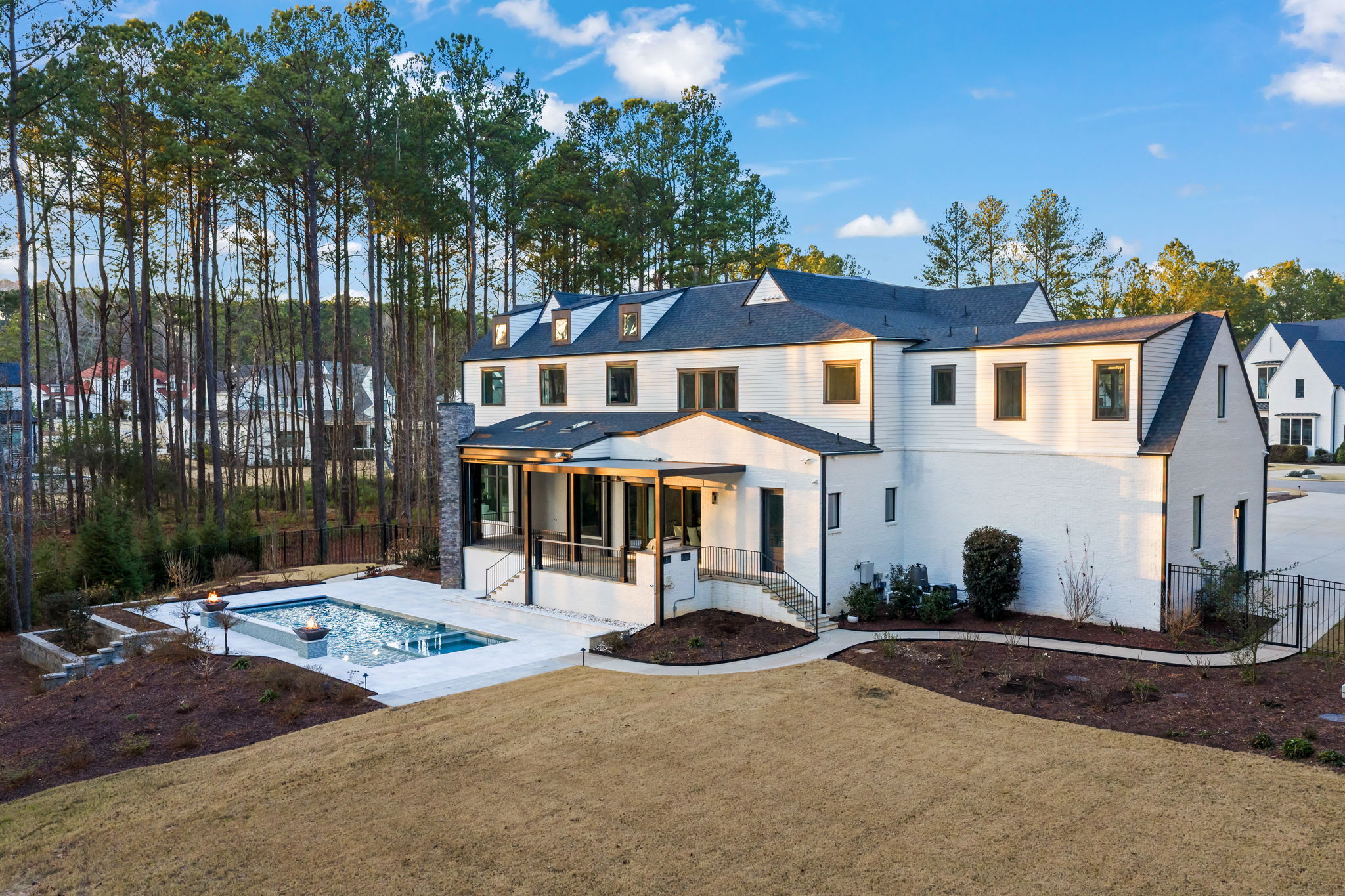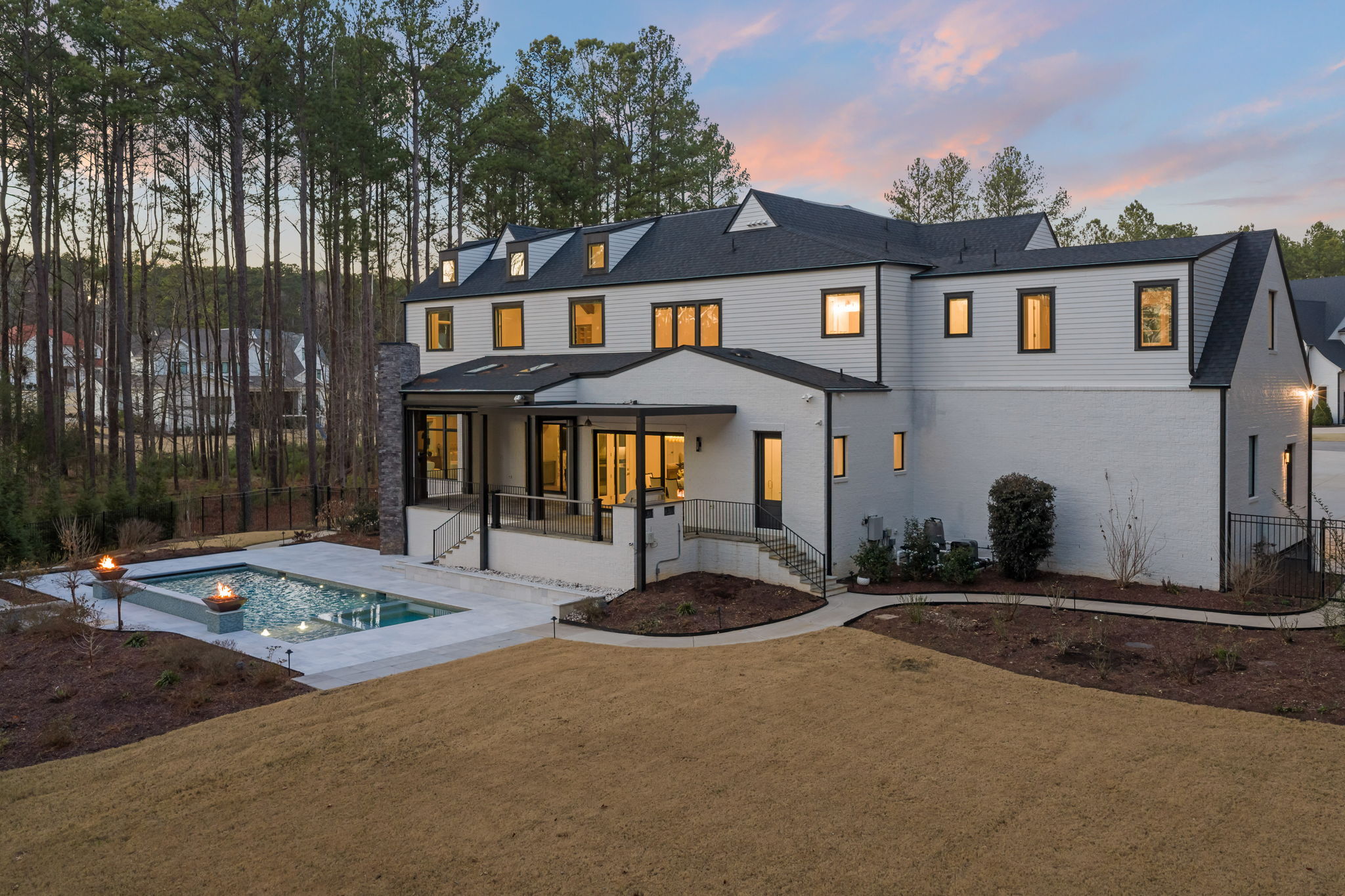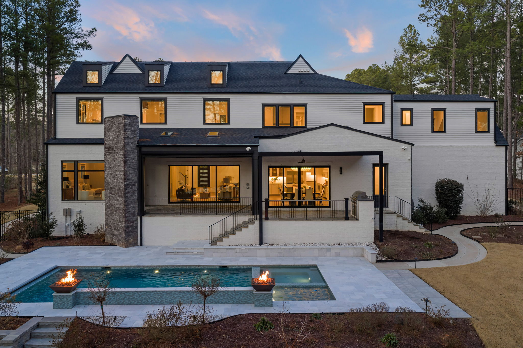 Set on 1.3 private acres in Avalaire, one of Raleigh’s most prestigious luxury communities, this 7,643-square-foot custom estate offers an exceptional blend of privacy, architectural sophistication, and premier location near RTP, downtown Raleigh, and RDU. Designed for both grand entertaining and everyday living, the home features four ensuite bedrooms and lives like five or six with two primary suites—one on the main level and one upstairs—plus multiple flex spaces for offices, media, or guest rooms. Retractable glass doors open the family room to a bluestone porch and an extraordinary outdoor living experience, anchored by a heated saltwater gunite pool with spa, fire and water features, and retractable cover, alongside a raised outdoor entertaining area with built-in grill and automated pergola. A private elevator, expansive bonus room with wet bar, five-car garage, circular drive, and meticulously landscaped grounds complete this rare estate, delivering luxury, lifestyle, and unforgettable entertaining in one of the Triangle’s most coveted neighborhoods.
