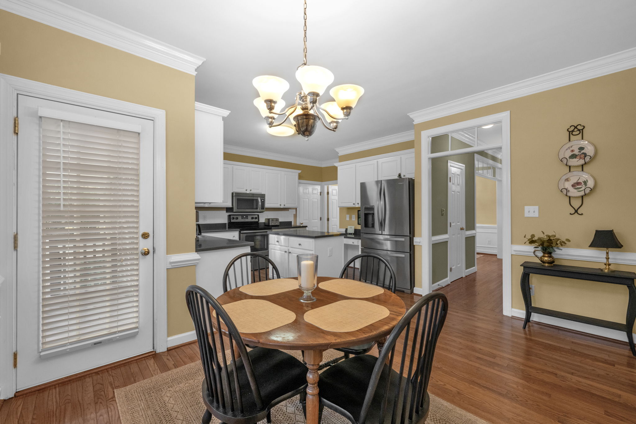 Experience the perfect balance of comfort and sophistication in this beautifully designed home, where modern convenience meets timeless style. Every detail has been thoughtfully crafted to support both relaxed everyday living and effortless entertaining. At the heart of the home, the kitchen features stainless steel appliances, a center island, and plenty of space to inspire your culinary creativity. Enjoy peaceful mornings in the bright breakfast area with easy access to your private deck and patio—ideal for al fresco dining or quiet moments outdoors. The formal dining room, adorned with wainscoting and crown molding, sets the stage for memorable gatherings, while the adjacent living room or home office offers a versatile space highlighted by elegant transom doorways. The primary suite provides a serene retreat, complete with a walk-in closet and a comfortable area for unwinding. Gleaming hardwood floors flow throughout much of the main level, bringing warmth and character to every space. A spacious, unfinished attic offers endless potential for customization. Perfectly situated near I-540, the new Publix shopping center, and Buffaloe Road Athletic Park & Aquatic Center, this home captures the essence of refined, modern living.