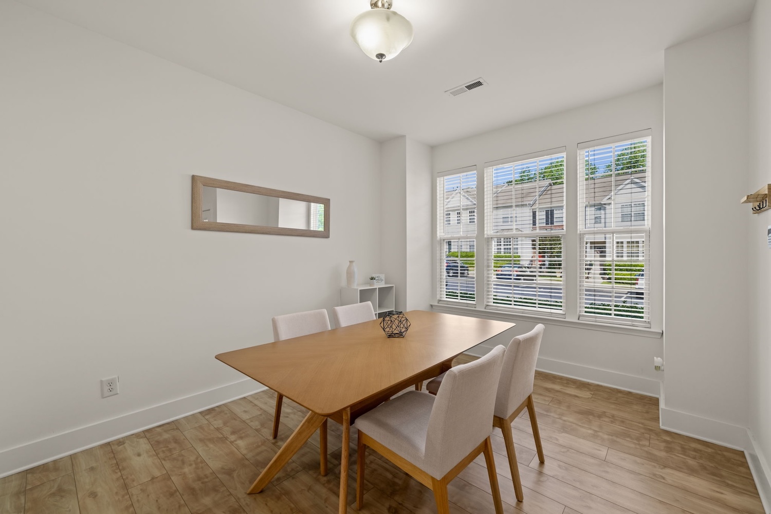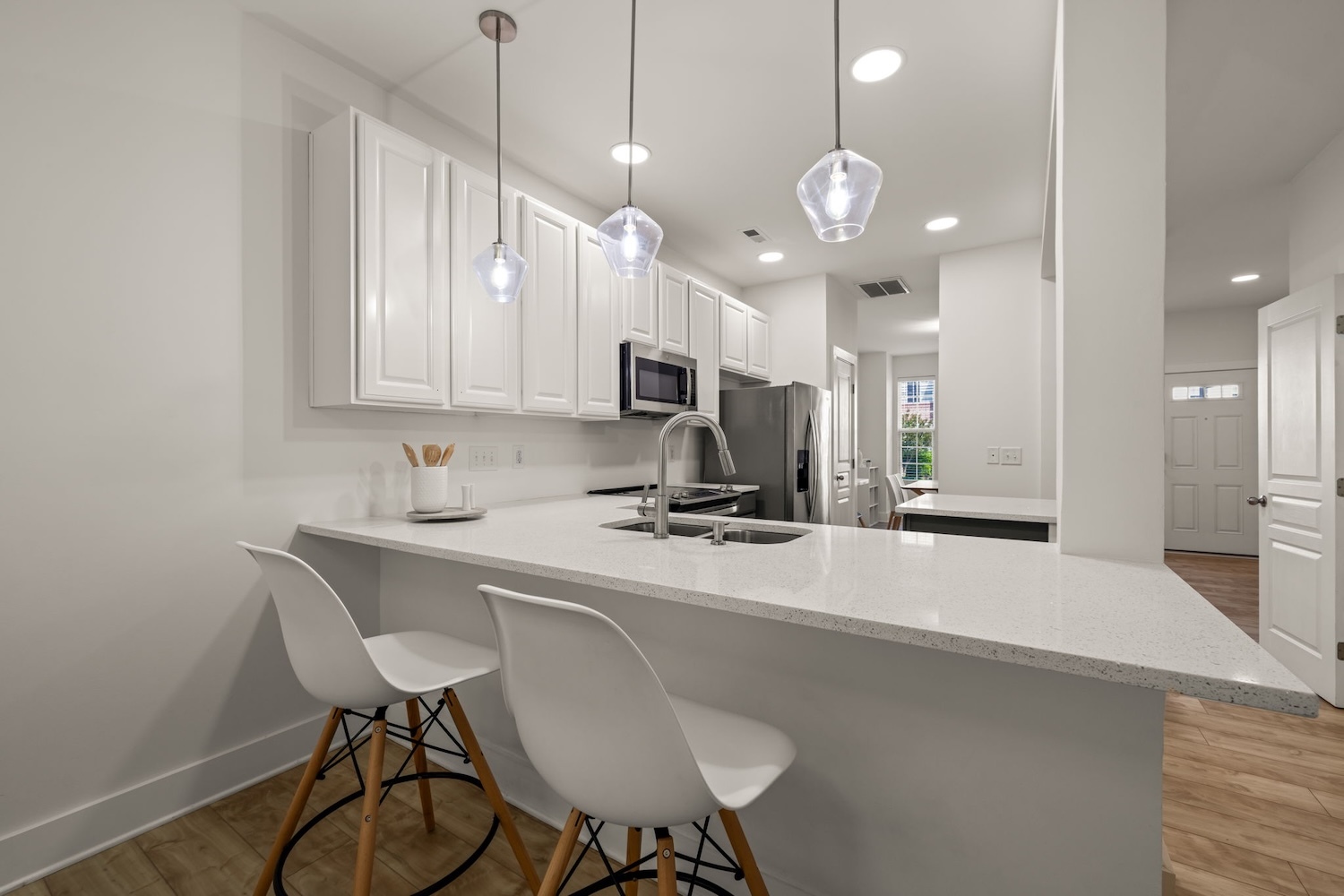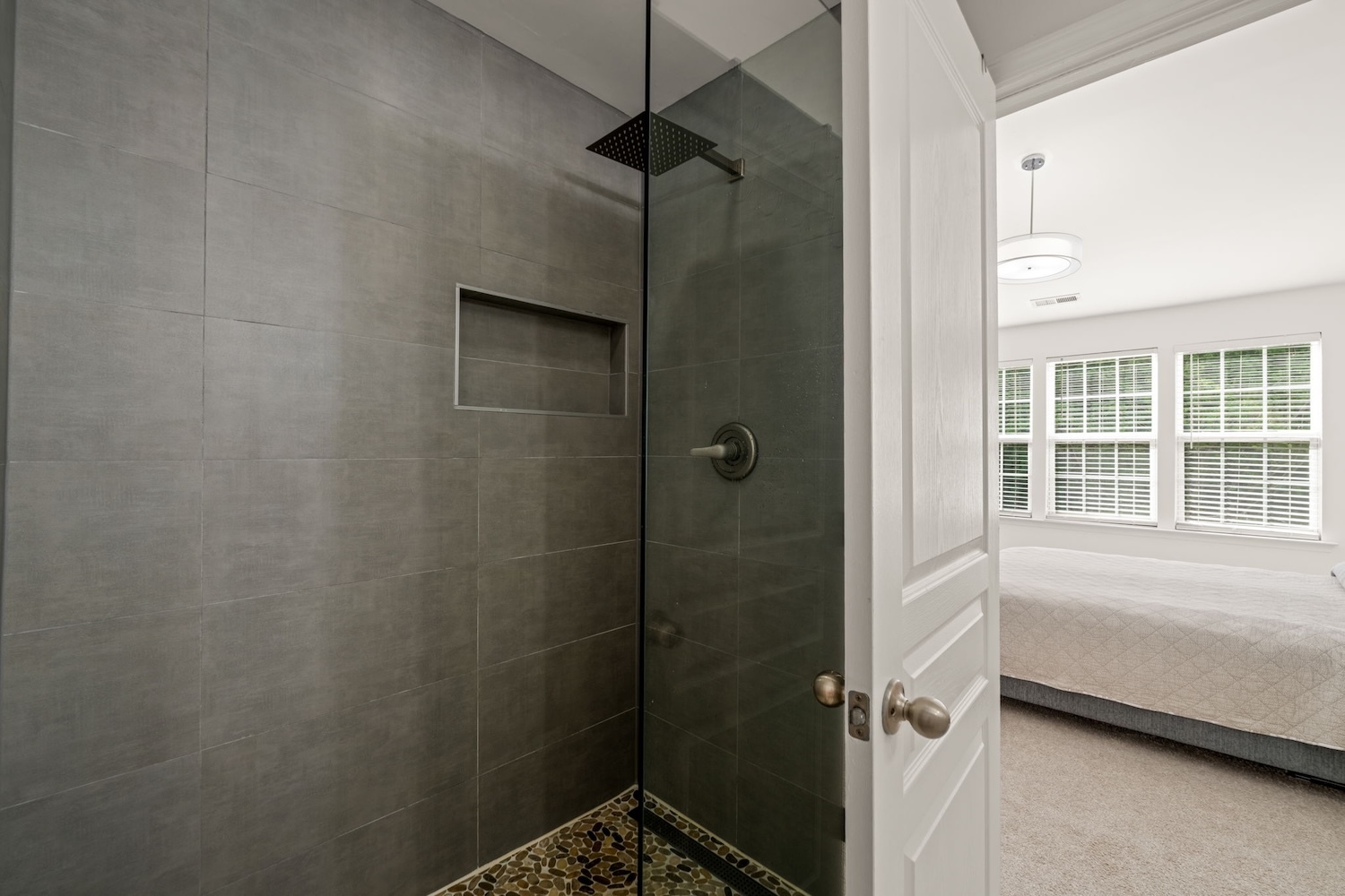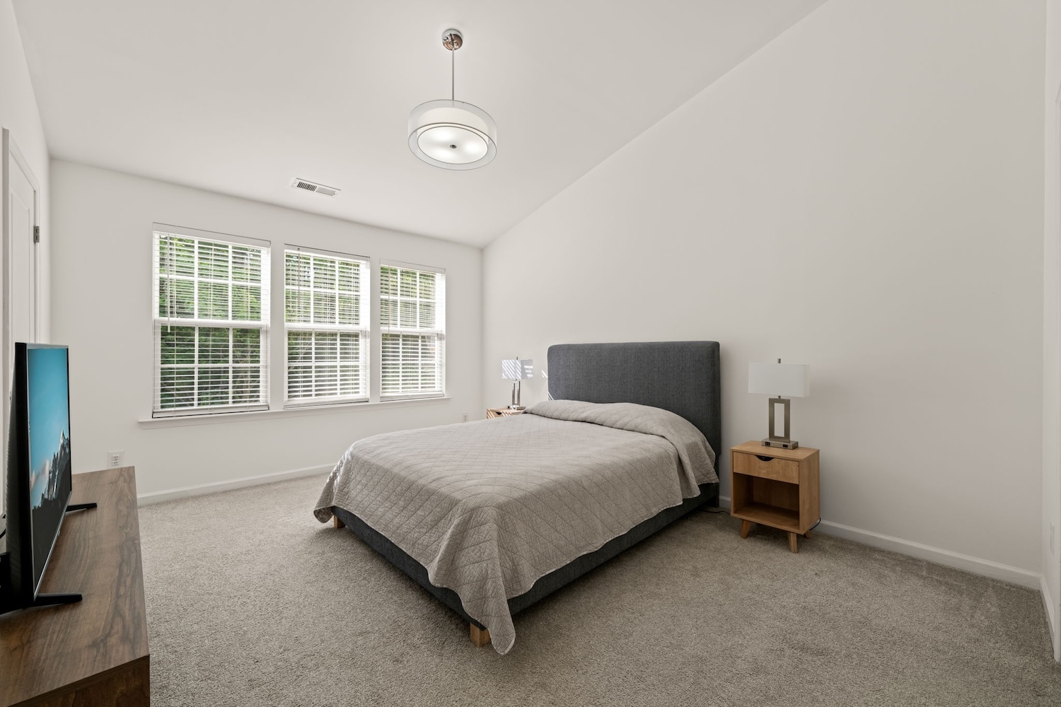 Stylish, move-in ready, and thoughtfully upgraded, this 2-bedroom, 2.5-bath townhome blends comfort, privacy, and convenience in a prime location. Each spacious bedroom features its own en-suite bath—ideal for roommates, guests, or creating your own personal retreat. On the main level, hardwood floors flow through the open dining and living areas, centered around a cozy corner gas-log fireplace. Step out to a private patio that overlooks a serene wooded area—perfect for quiet mornings or unwinding after a long day. The kitchen sets this home apart, having been widened for improved functionality and extra natural light. It boasts quartz countertops, a large center island with seating, and stainless steel appliances—a dream setup for home chefs. Upstairs, the primary suite features vaulted ceilings, a walk-in closet, and a beautifully updated bathroom with a fully tiled shower, river rock flooring, and modern fixtures. Located just steps from the community pool and minutes from Brier Creek, RDU Airport, and I-540, this home combines easy living with unbeatable access. HVAC recently serviced, and a one-year home warranty is included for added confidence. This home is truly a standout—don’t miss your chance to see it.